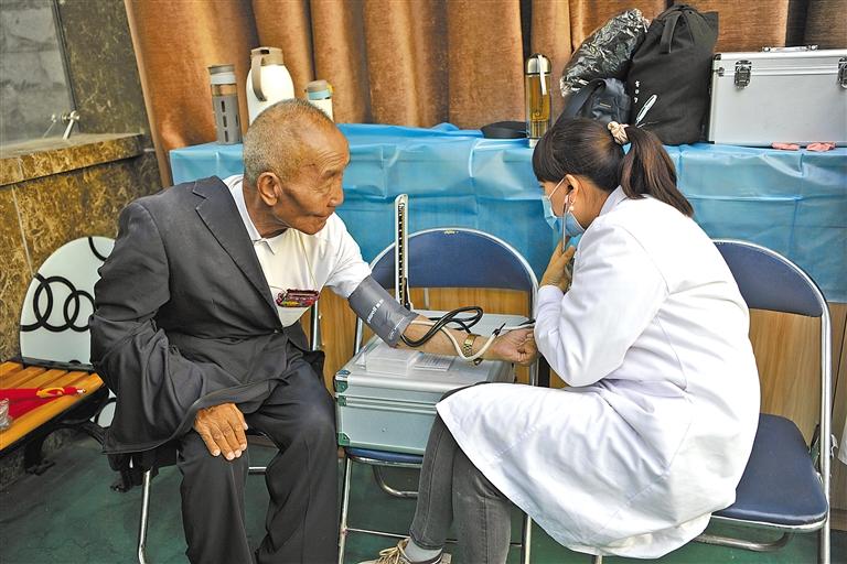 圖為醫(yī)護人員在為退休干部測量血壓。記者 旦增蘭澤 王敏 攝
