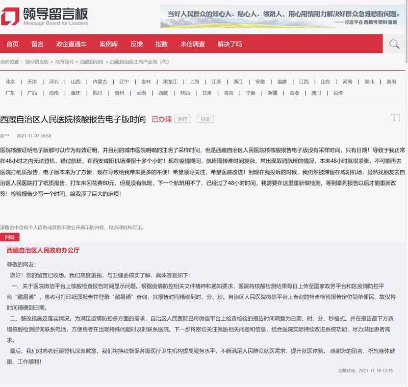 收到留言后,西藏自治區(qū)人民政府辦公廳高度重視,立即與西藏自治區(qū)衛(wèi)健委了解核實,向這位網(wǎng)民致以歉意,并作了詳細答復: