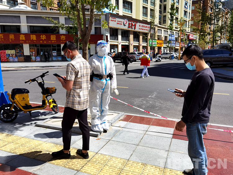 林芝邊境管理支隊(duì)機(jī)關(guān)民警曹婷正在核酸檢測(cè)點(diǎn)維護(hù)現(xiàn)場(chǎng)秩序 攝影:張航