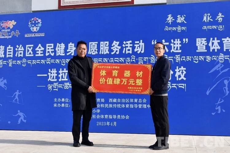 活動開幕式現(xiàn)場,西藏自治區(qū)體育局社體中心向拉薩市實驗小學東城分校,配發(fā)了價值四萬元整的校園體育器材,保障學生日常體育運動需要?! ?/p>
