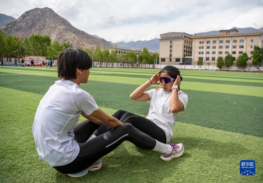 在西藏自治區(qū)體育運動技術(shù)學校,玉珍拉姆(右)在訓練中做仰臥起坐(4月29日攝)。新華社記者 孫非 攝