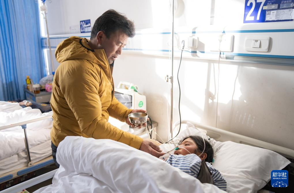 1月9日,在日喀則市人民醫(yī)院婦產(chǎn)科病房,產(chǎn)婦家人在喂產(chǎn)婦吃飯。新華社記者 丁增尼達 攝 ??
