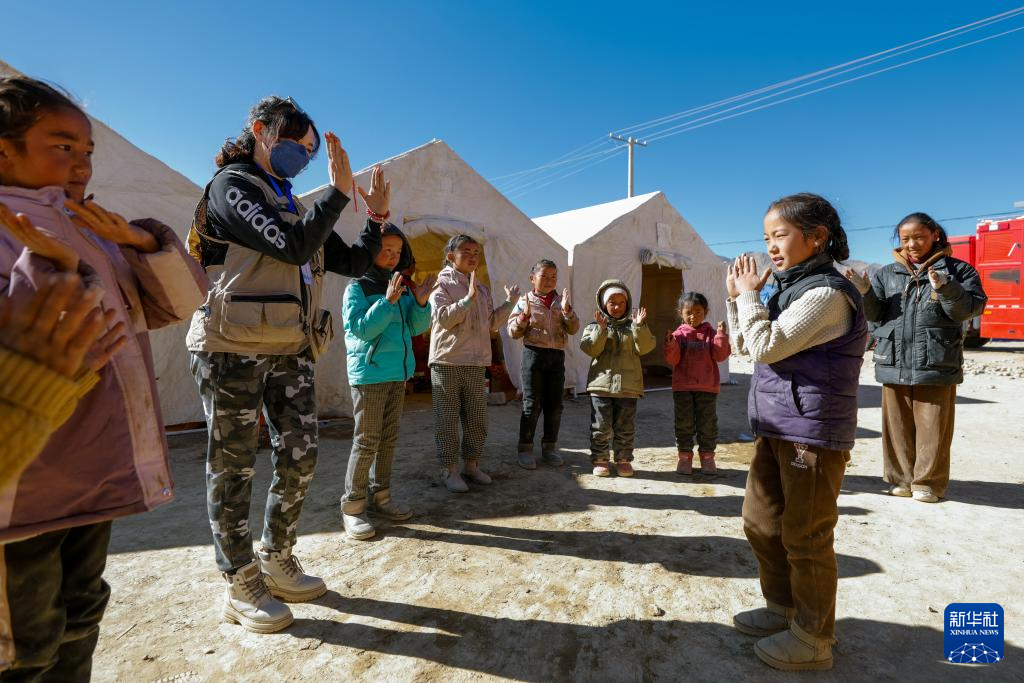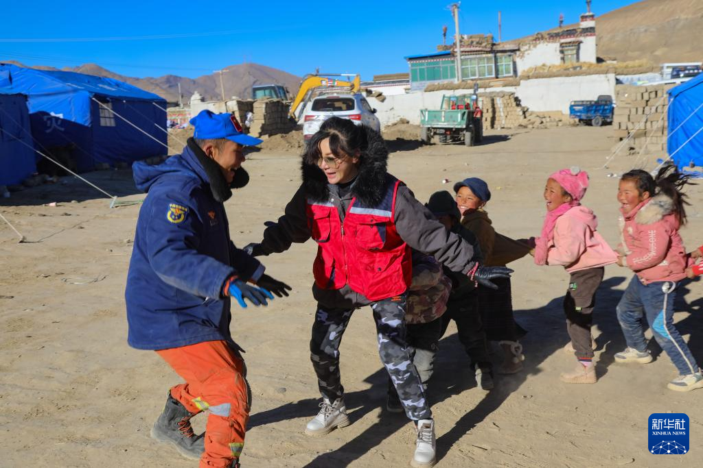 1月10日,在定日縣曲洛鄉(xiāng)措昂村的受災(zāi)群眾安置點,譚惜仁(左二)與西藏森林消防總隊的救援人員(左一)一起帶著孩子們與玩游戲。新華社發(fā)(鄭龍 攝) ??