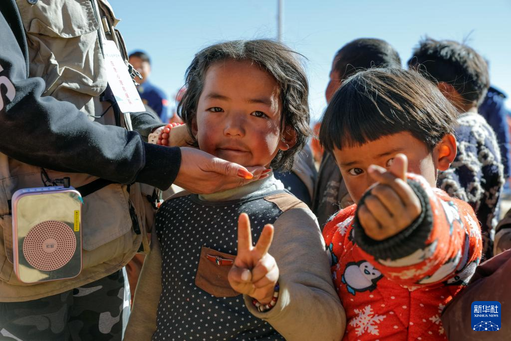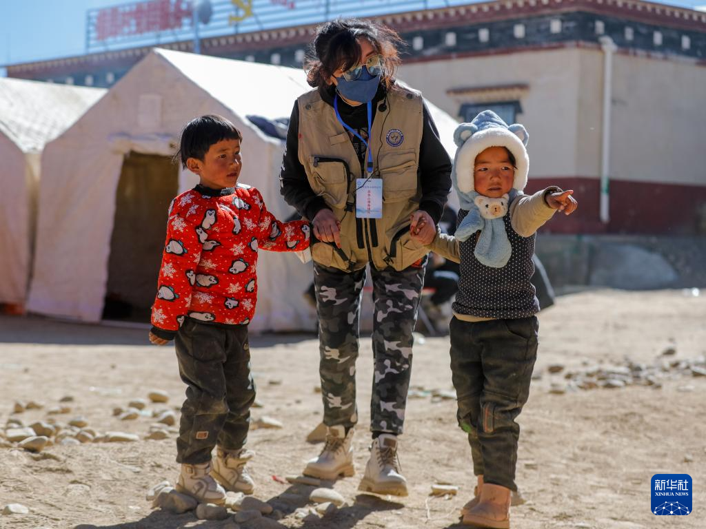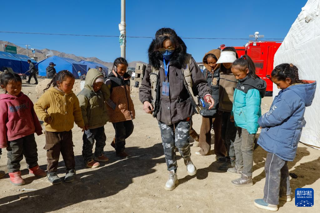 1月11日,在定日縣曲洛鄉(xiāng)措昂村的受災(zāi)群眾安置點,譚惜仁(中)與孩子們在一起。新華社記者 沈伯韓 攝 ??