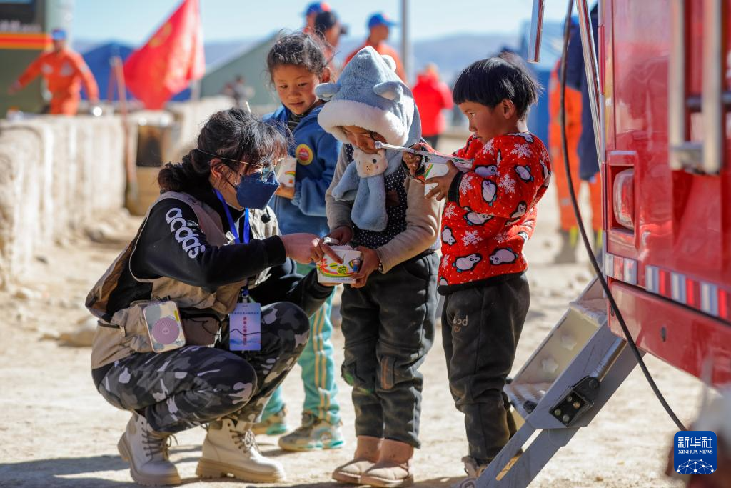 1月11日,在定日縣曲洛鄉(xiāng)措昂村的受災(zāi)群眾安置點,譚惜仁(左一)陪著孩子們吃午餐。新華社記者 沈伯韓 攝 ??