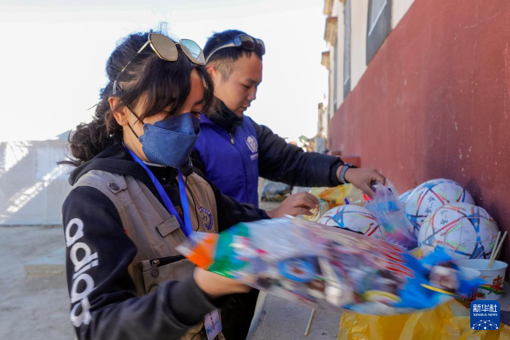 1月11日,在定日縣曲洛鄉(xiāng)措昂村的受災(zāi)群眾安置點,譚惜仁(左)與志愿者一起整理捐給孩子們的足球、畫筆、食品等物資。新華社記者 沈伯韓 攝 ??