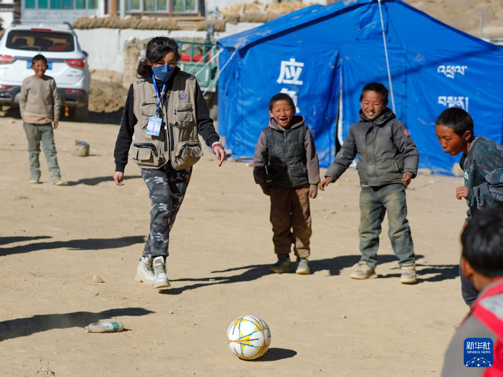 1月11日,在定日縣曲洛鄉(xiāng)措昂村的受災(zāi)群眾安置點,譚惜仁與孩子們一起踢足球。新華社記者 沈伯韓 攝 ??