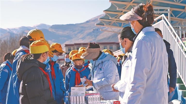 圖為巡診醫(yī)療隊(duì)隊(duì)員為墨竹工卡縣南京實(shí)驗(yàn)小學(xué)學(xué)生講解流感預(yù)防知識。記者 格桑倫珠 攝
