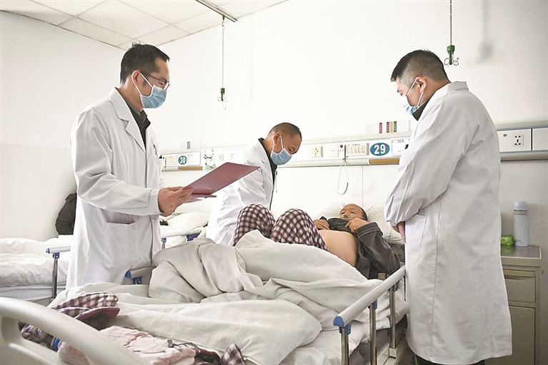 圖為西藏軍區(qū)總醫(yī)院普通外科專家團(tuán)隊(duì)在查房,普布次仁醫(yī)生(左二)對患者進(jìn)行腹部檢查。通訊員 西培多杰 攝