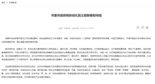 慰問信中說,回首這一年,張伯禮院士秉持國家和人民利益至上,胸懷大局,無私奉獻,為全國疫情防控,為中醫(yī)藥事業(yè)振興,為天津高質(zhì)量發(fā)展,傾注了大愛情懷,榮獲全國道德模范稱號,令我們欽佩不已。特別是面對奧密克戎病毒株引發(fā)的首起本土聚集性疫情,張伯禮院士再次聞令而行、沖鋒一線,為天津疫情防控作出了突出貢獻。新時代建功新業(yè)績。