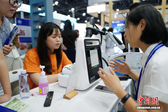 參展者了解中醫(yī)經(jīng)絡(luò)采集系統(tǒng)。張煜歡 攝