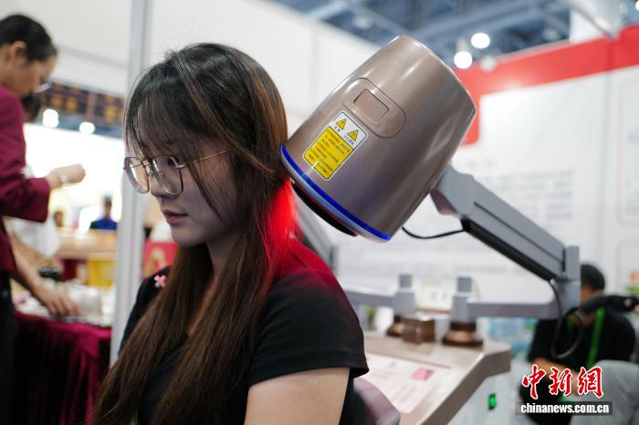 參展者體驗(yàn)艾灸儀。張煜歡 攝