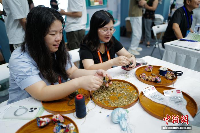 參展者體驗(yàn)香囊制作。張煜歡 攝