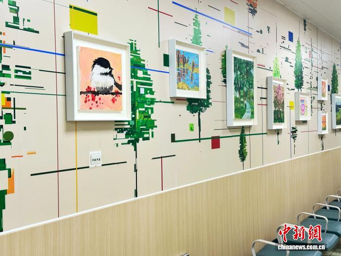 王波特別介紹了作品《回聲-初啼》的創(chuàng)作過(guò)程,靈感源自他在醫(yī)院駐留期間的感受,作為新生兒父親,他以孩子的哭聲為聲源,通過(guò)聲波可視化技術(shù)與3D打印形成多組彩色波動(dòng)圖形,隱喻生命初期的狀態(tài)與情感張力。另一件《生長(zhǎng)的影子》則結(jié)合醫(yī)院20多米長(zhǎng)廊的原有結(jié)構(gòu),以數(shù)字繪畫(huà)結(jié)合藝術(shù)微噴手法呈現(xiàn)樹(shù)木生生不息的意象,并邀請(qǐng)醫(yī)護(hù)人員參與進(jìn)來(lái),將醫(yī)院就診空間與自然主題融為一體。