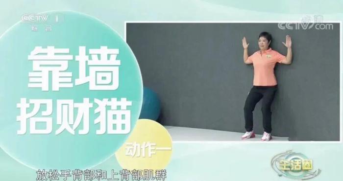 如果出現(xiàn)五點(diǎn)不能完全緊貼墻面的情況,說明可能出現(xiàn)了含胸駝背的現(xiàn)象,這個時候我們可以通過“靠墻招財貓”的動作,強(qiáng)化背肌力量,改善駝背體態(tài)。
