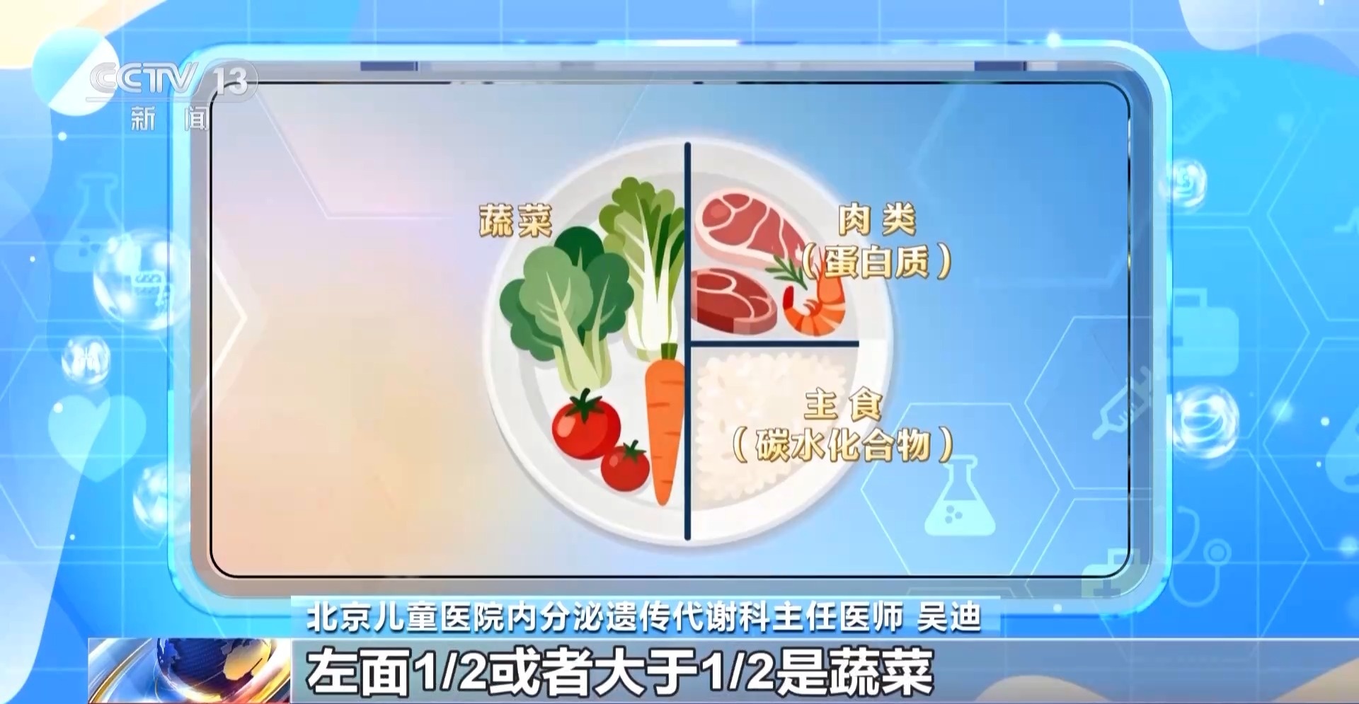 北京兒童醫(yī)院內分泌遺傳代謝科主任醫(yī)師 吳迪:早上要吃飽,開啟一天的生活元氣滿滿,中午要吃好,營養(yǎng)要均衡搭配,晚上要吃得早一些,吃得少一些,睡覺前2到3個小時不建議進食。一般情況下一個圓盤子,可以中間畫一條線,左面1/2或者大于1/2是蔬菜,右側上面1/4是蛋白質,右側下面1/4是主食。