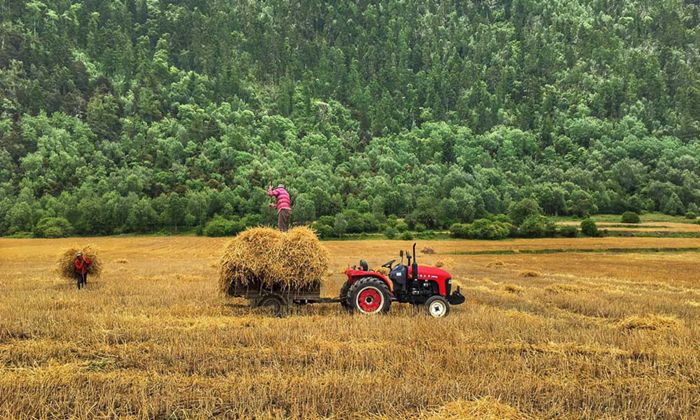 秋天是收獲的季節(jié),農(nóng)牧民把收獲的青稞秸稈裝上拖拉機。