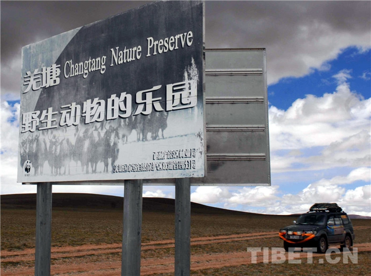 圖為一輛自駕游車輛通過羌塘國(guó)家級(jí)自然保護(hù)區(qū)的標(biāo)志牌(2009年) 攝影:唐召明