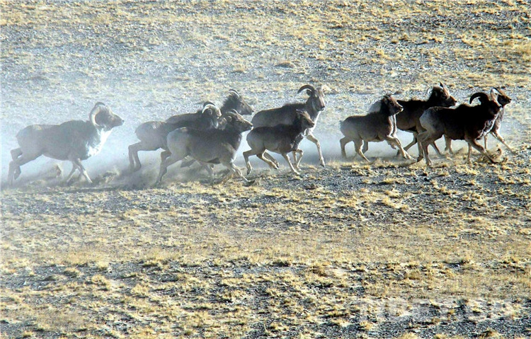 圖為奔跑在羌塘國(guó)家級(jí)自然保護(hù)區(qū)的國(guó)家二級(jí)保護(hù)動(dòng)物盤羊(2006年) 攝影:唐召明