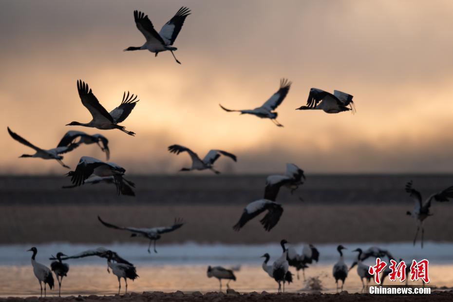 2月17日,西藏拉薩市林周縣黑頸鶴保護區(qū)內,黑頸鶴翩躚起舞、分外美麗。中新社記者 何蓬磊 攝