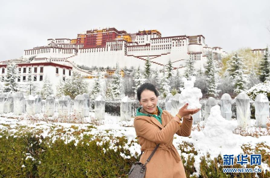 3月14日,在布達(dá)拉宮前,一名路人舉起一個(gè)雪人留影。