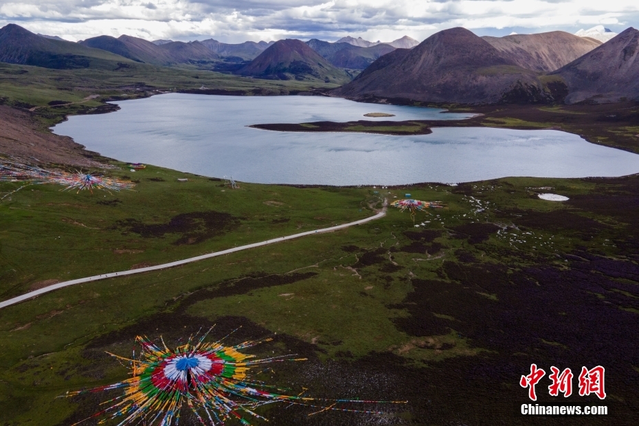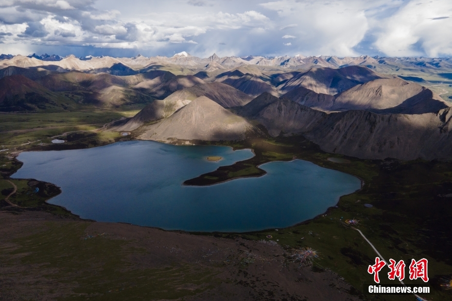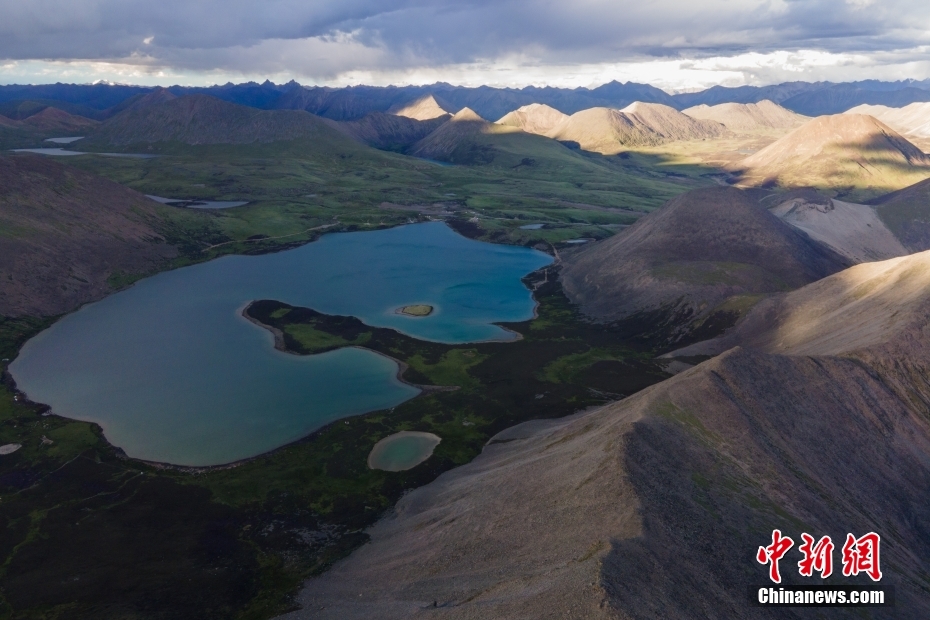 6月23日,思金拉措湖風(fēng)光秀麗。思金拉措位于西藏墨竹工卡縣日多鄉(xiāng),海拔4500多米,周邊群峰簇?fù)恚匦为q如聚寶盤(pán),不少民眾將其稱為西藏的“財(cái)神湖”。(無(wú)人機(jī)照片) 中新社記者 江飛波 攝