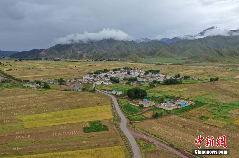 9月8日,西藏自治區(qū)拉薩市林周縣境內的田野美景。金秋時節(jié),拉薩河谷一帶青稞成熟,呈現豐收美景。(無人機照片)中新社記者 貢嘎來松 攝