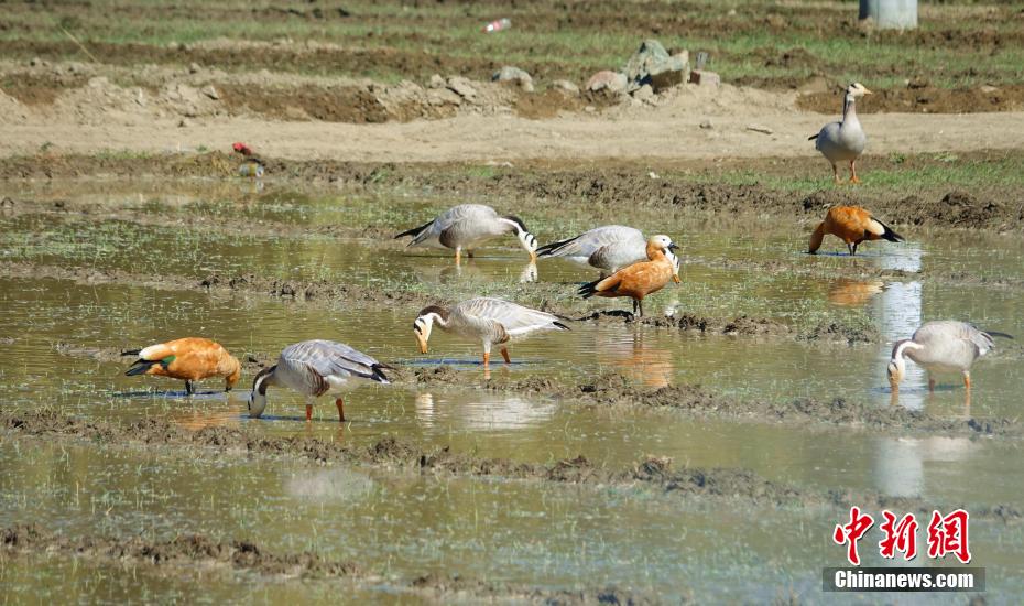 圖為11月12日,斑頭雁、赤麻鴨等鳥類在西藏山南市扎囊縣境內(nèi)的農(nóng)田內(nèi)。冉文娟 攝