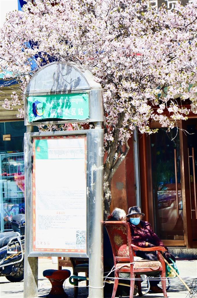 住在拉薩靠北邊的市民同樣能一飽眼福。娘熱北路兩側的榆葉梅已全部綻放,而緊鄰娘熱路的慈松塘中路和慈松塘東路更是一片春花爛漫的美好景象。慈松塘中路和北路的榆葉梅栽種較為密集,成團成簇的淡粉色花朵擠在枝頭,樹下乘涼的老奶奶、樹邊??康墓卉嚕诨ǘ涞募映窒拢S手一拍便是故事感極強的畫面。