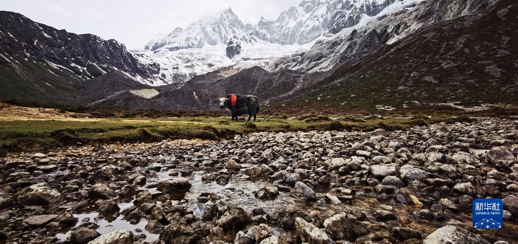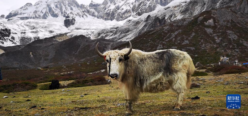 這是4月30日拍攝的庫拉崗日雪山前的牦牛。新華社記者 沈虹冰 攝