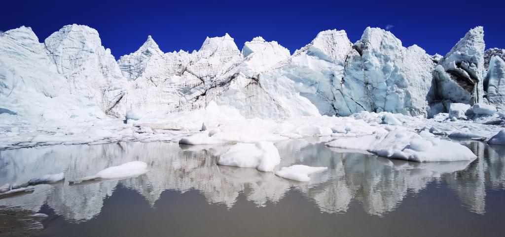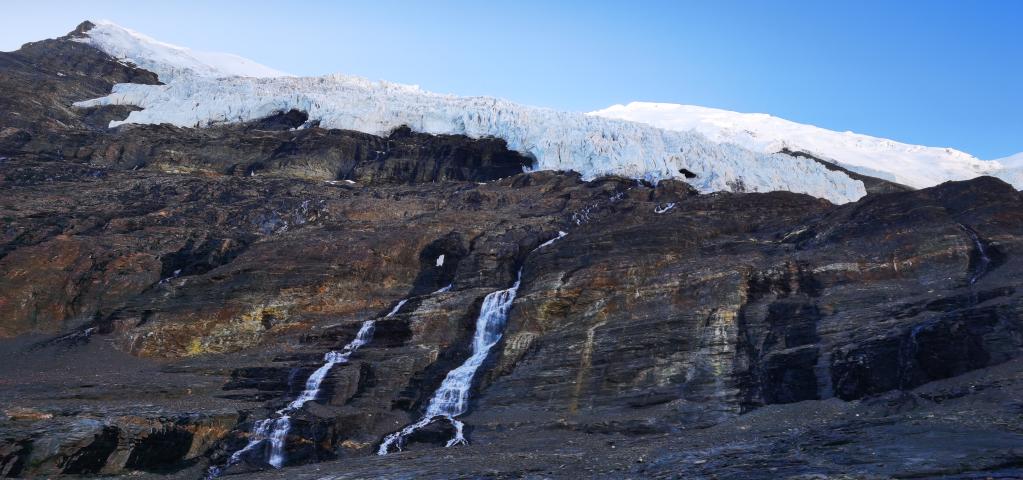 這是位于山南市浪卡子縣的卡若拉冰川,冰川融水形成河流(6月3日攝,無人機照片)。新華社記者 沈虹冰 攝