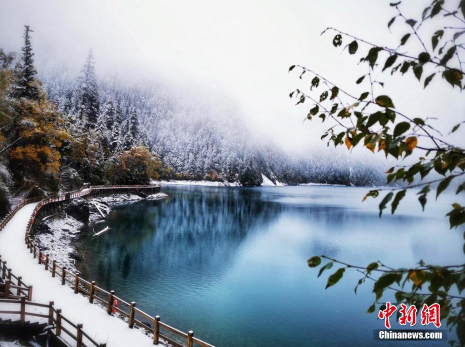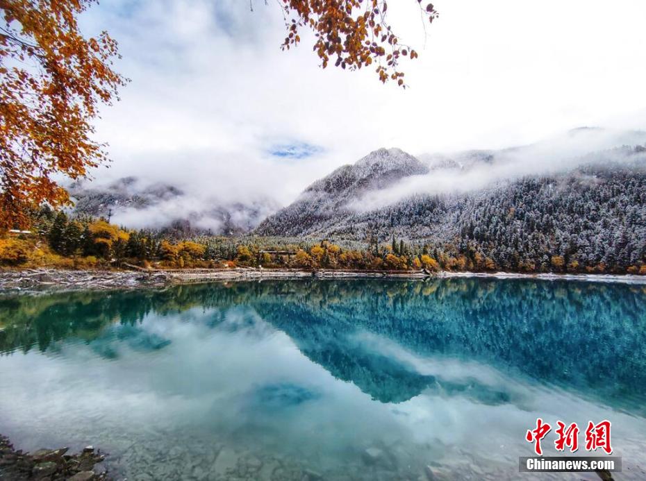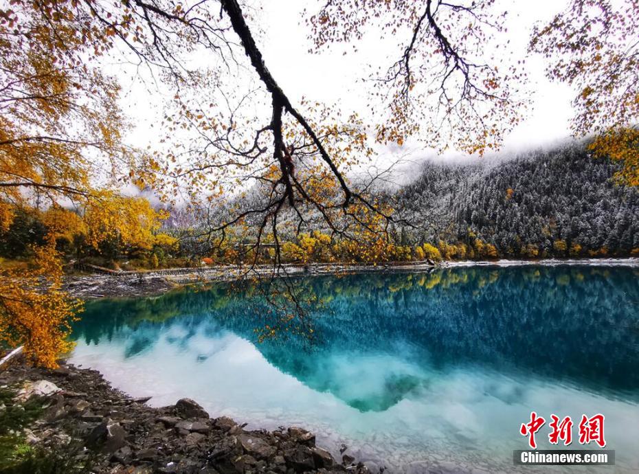 十月,九寨溝長海、原始森林等景點迎來入秋后的第一場雪。澄凈碧藍(lán)的海子和金色的彩林與潔白的雪花相映相襯,構(gòu)成一幅靜謐的美麗畫卷。遠(yuǎn)遠(yuǎn)看去,成片的彩林被一朵朵雪花點綴,美得像童話世界一般。 梁峰 攝