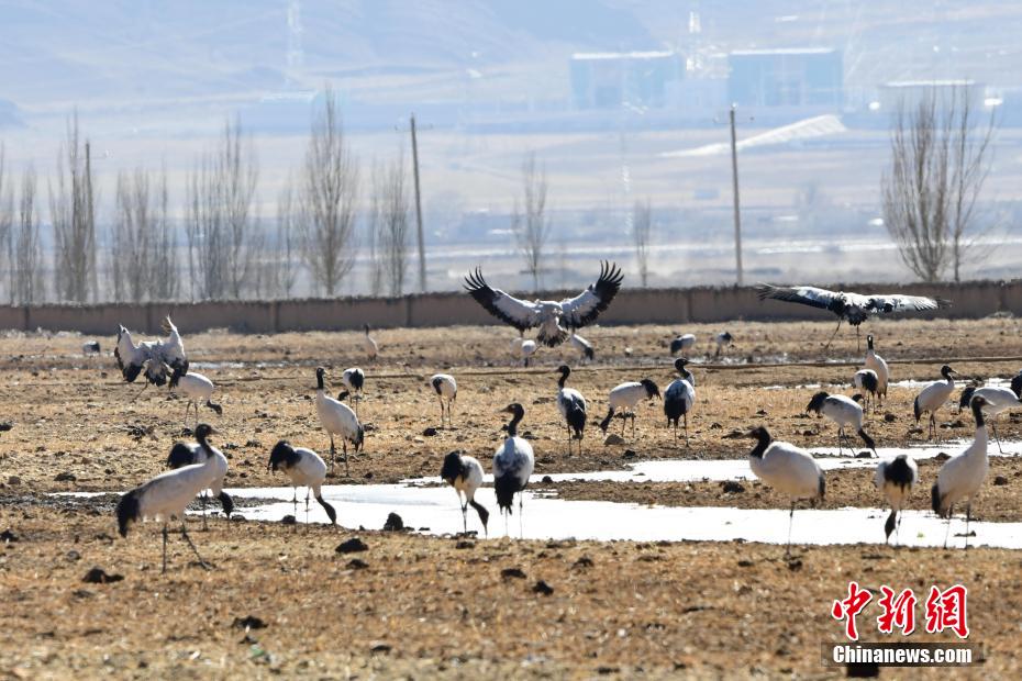 每年的10月底,成群的黑頸鶴飛到西藏拉薩市林周縣越冬,在拉薩市林周縣周邊的湖泊濕地度過5個月的“閑云野鶴”生活,次年三四月份再飛向藏北草原繁殖。黑頸鶴是世界上唯一一種高原鶴類。具有足長、喙長、頸長的典型涉禽類特征,適合在沼澤地里行走。黑頸鶴的頸、尾為黑色,體羽為灰白色。黑頸鶴是國家一級保護動物。目前,每年到林周縣越冬的黑頸鶴已達2000只左右。圖為黑頸鶴在林周境內(nèi)的農(nóng)田里覓食、嬉戲。 貢嘎來松 攝
