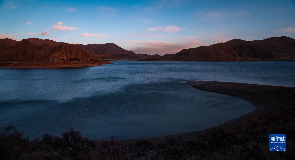 這是夕陽下的羊卓雍錯(cuò)(1月1日攝)。新華社記者 姜帆 攝