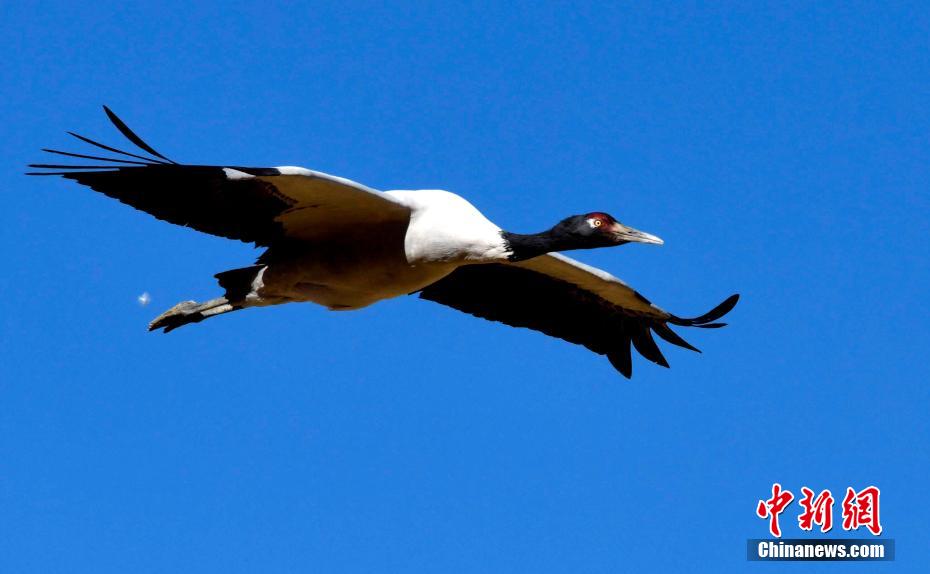 圖為11月21日,西藏日喀則市桑珠孜區(qū)邊雄鄉(xiāng),黑頸鶴振翅高飛。李林 攝