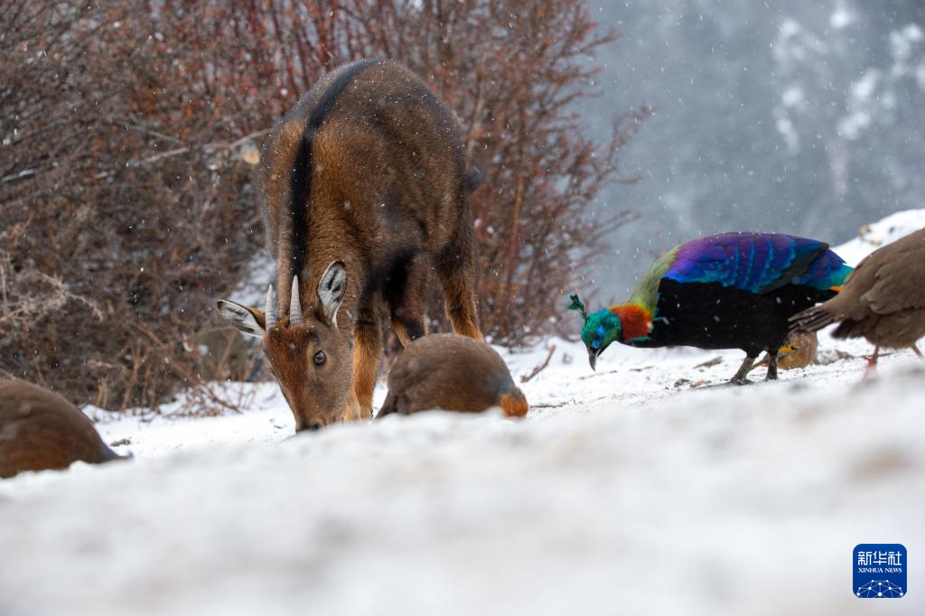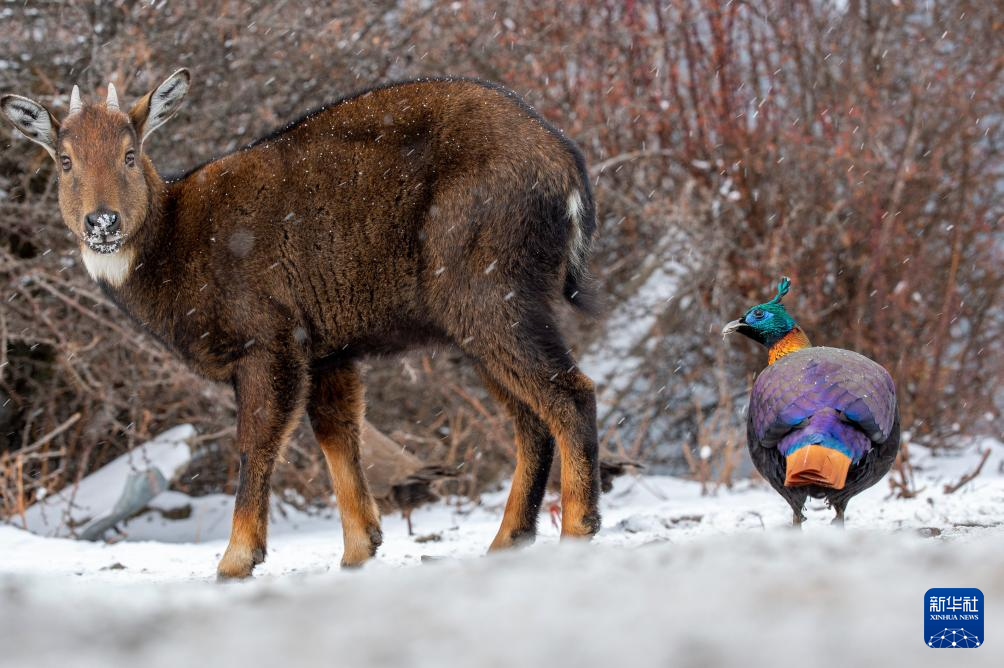 1月17日拍攝于西藏山南市洛扎縣的喜馬拉雅斑羚和棕尾虹雉等野生動(dòng)物。新華社記者 旦增尼瑪曲珠 攝