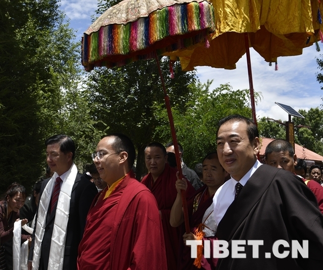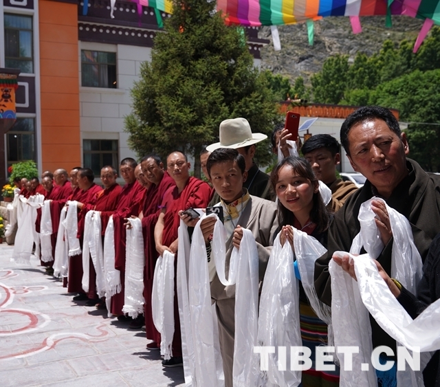 當大院內(nèi)響起法號聲時,早已在此等候的僧俗信教群眾紛紛翹首踮足,盼望一睹十一世班禪的風采。十一世班禪剛下車,高僧們手持香爐,打著幡幛、華蓋,吹奏佛樂,以藏傳佛教最隆重的禮儀迎接班禪額爾德尼?確吉杰布的到來。身著藏族傳統(tǒng)盛裝的男女青年,向十一世班禪敬獻象征吉祥如意的“切瑪”,表達拉薩各族各界人士和僧俗信教群眾的美好祝愿。在此等候的自治區(qū)有關領導也與十一世班禪互敬哈達、互致問候。