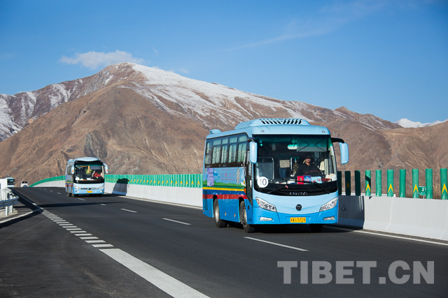 圖為旅游大巴行駛在拉薩至林芝高等級(jí)公路上。攝影:趙耀