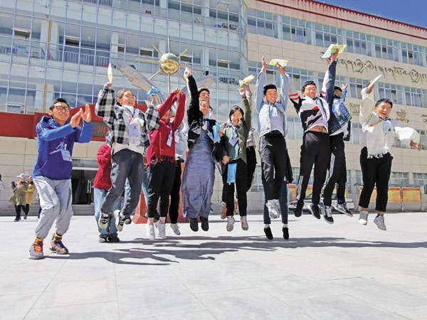 圖為結(jié)束藏語文考試的考生慶祝高考結(jié)束。來源:西藏日報(bào) 攝影:王莉