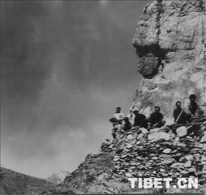 圖為懸空打炮眼。在峰巒險峻的雀兒山開鑿石方,全靠人工用鋼針打眼、放炮。翻拍:李元梅