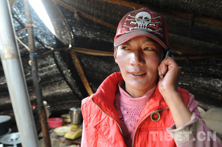 圖為嘎措鄉(xiāng)牧女頓珠卓瑪在夏季放牧點(diǎn)的帳篷里使用手機(jī)與家人通話報(bào)平安(2009年8月1日) 攝影:唐召明