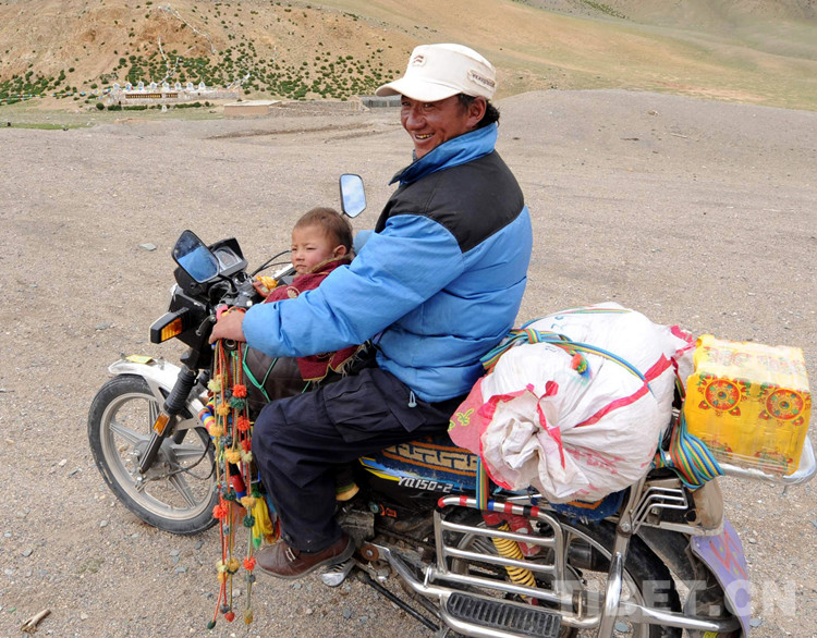 圖為一位牧民騎摩托車帶著孩子串門。目前,這個(gè)鄉(xiāng)的90多戶牧民家家戶戶都有了摩托車(2009年8月1日) 攝影:唐召明