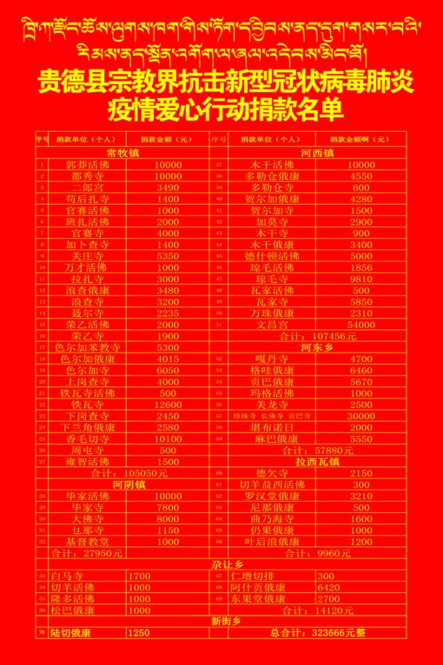 “一方有難、八方支援”。2月7日,隨著疫情防控形勢(shì)嚴(yán)峻復(fù)雜,相關(guān)醫(yī)療物資緊缺,貴德縣佛教協(xié)會(huì)主動(dòng)向全縣佛教界提出倡議,為疫情防控工作伸出援手、獻(xiàn)出愛(ài)心。截至目前,貴德縣佛教界共捐款323666元人民幣,為疫情防控奉獻(xiàn)愛(ài)心。