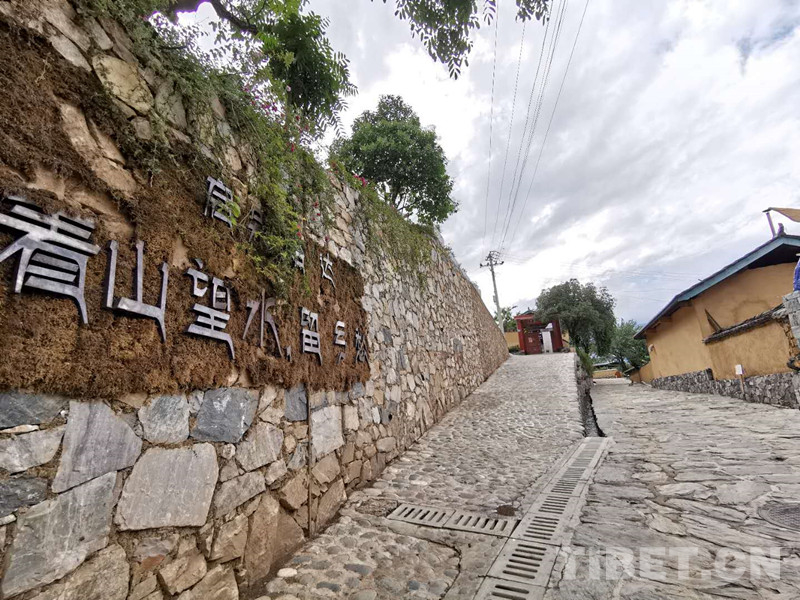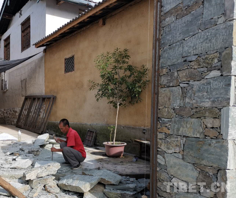 漫步村間,石板鋪就的道路縱橫交錯,與居民房舍相連。鳥語蟬鳴,人與自然在這里和諧共生。遠處傳來石頭的敲擊聲,沿石板路而上,循聲走近,看到一位大爺在家門口敲擊著大石塊,記者便好奇地上前詢問。這位大爺告訴我們,他在修建自家的大門。