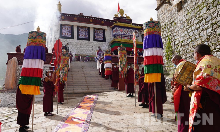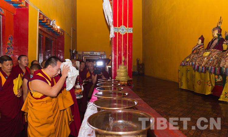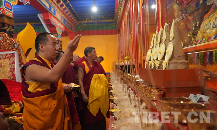 在乳巴寺,十一世班禪先后朝拜了甘珠爾拉康、文物珍寶殿、護法神殿等,隨后在杜康殿為僧眾摸頂傳授《兜率天上師瑜伽修法》。(中國西藏網(wǎng) 記者/王淑 趙耀 鄭朔)