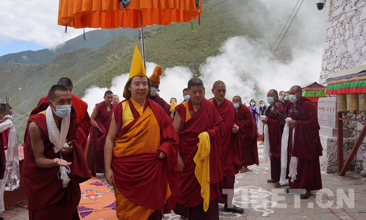 圖為8月5日,曲水縣熱堆寺僧眾列隊迎接十一世班禪的到來 攝影:王淑