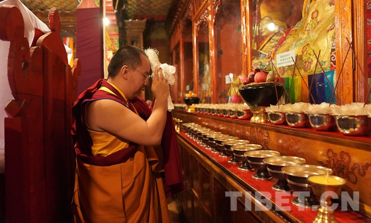 圖為十一世班禪在乳巴寺向佛像敬獻哈達 攝影:鄭朔