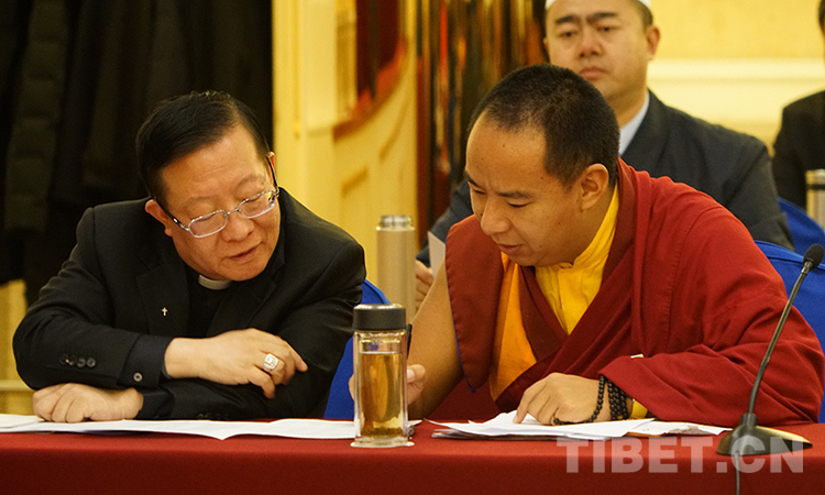 圖為2018年全國兩會期間,十一世班禪參加小組會時與中國天主教主教團主席馬英林討論 攝影:宋家麗