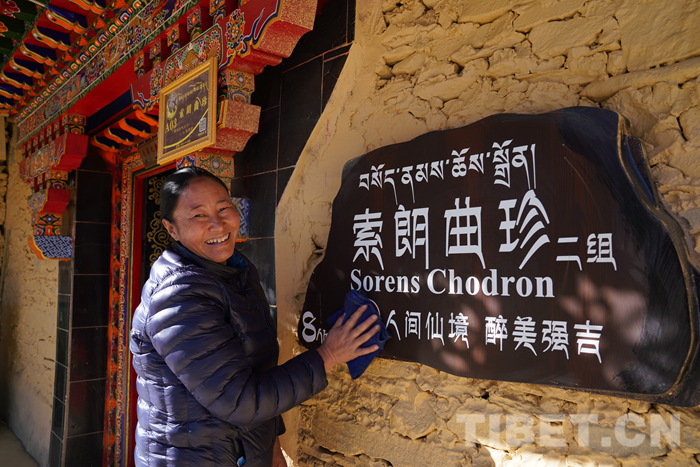圖為索朗曲珍正在擦亮自家民宿門牌