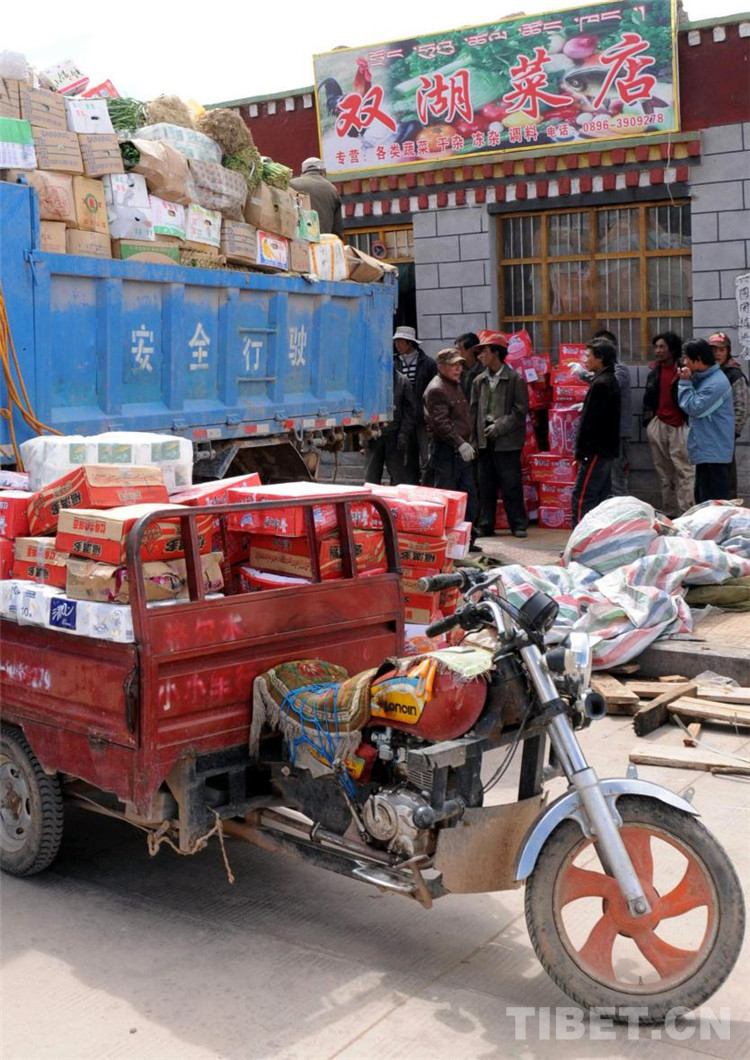 這是雙湖特別區(qū)(現(xiàn)為雙湖縣)的“雙湖菜店”正在準備把包車運來的蔬菜等物品卸貨(唐召明2009年8月攝)